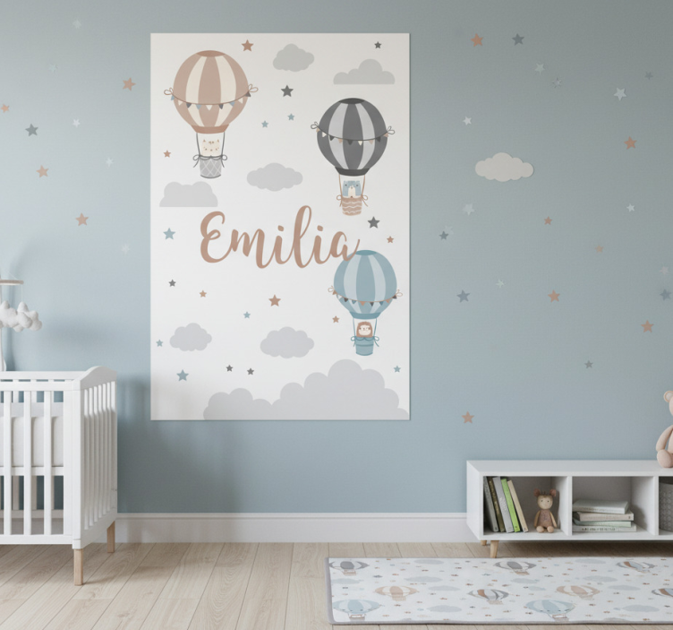 이 이미지는 화려한 열기구가 푹신한 구름과 반짝이는 별들 사이에 떠 있는 기발한 장식품을 특징으로 합니다. 개인적인 터치를 강조하며, 이름 'Emilia'가 작품을 우아하게 장식하여 매력적인 분위기를 만듭니다. 이 장난기 가득한 디자인은 아이의 유아실이나 놀이 공간에 적합하며, 상상력을 자극합니다. 포스터 어린이 침실 파스텔 색상 풍선과 구름