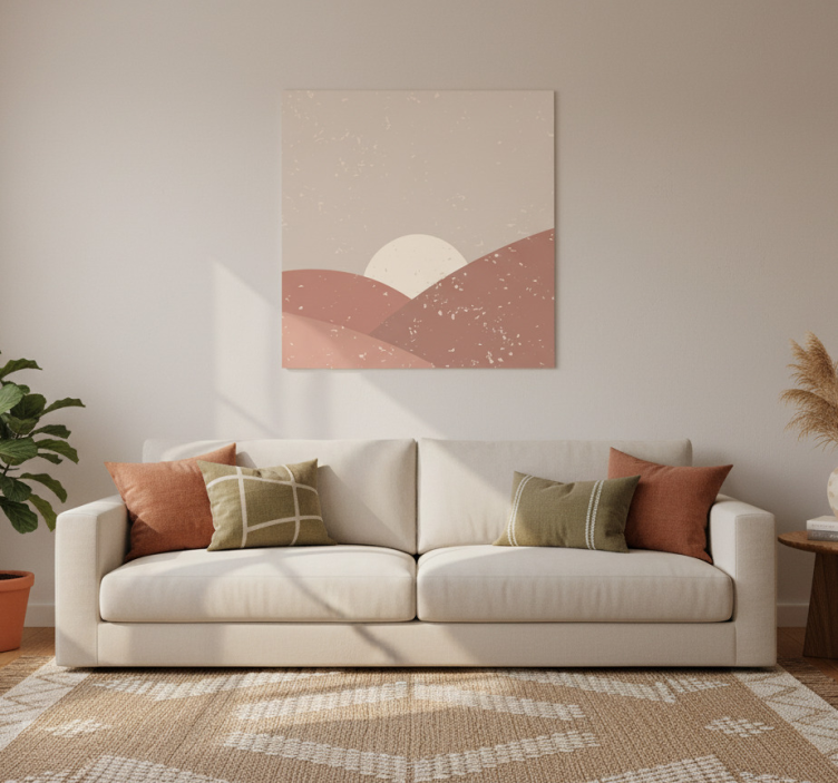 스타일리시한 거실은 자연 색조의 쿠션이 장식된 미니멀한 소파와 아늑한 러그로 꾸며져 있습니다. 그 뒤에는 부드러운 태양 아래 구릉이 펼쳐진 평화로운 예술 작품이 있어 차분한 분위기를 제공합니다. 화분에 심어진 푸른 식물이 생동감 있는 분위기를 더해주어 초대하고 편안한 공간을 만듭니다. 거실용 포스터 침실 여명 벽 아트