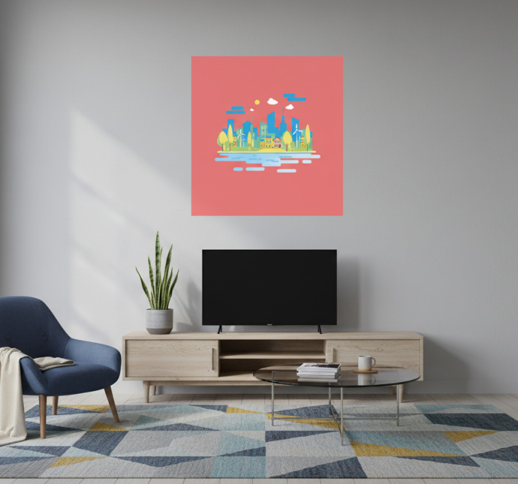 이 다채로운 일러스트레이션은 울창한 나무와 평화로운 수역으로 둘러싸인 활기찬 도시 경관을 특징으로 합니다. 태양광 패널과 풍력 터빈이 있는 밝은 건물들은 지속 가능성을 강조합니다. 장난기 가득한 구름과 빛나는 태양이 따뜻함을 더해주어 이 작품은 현대적인 생활 공간에 완벽합니다. 배경은 부드러운 분홍색입니다. 포스터 도시 및 국가 현대 도시 풍경
