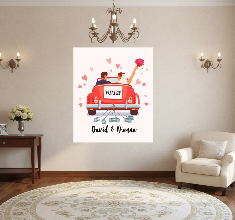 이 매력적인 일러스트는 한 쌍의 커플이 생동감 넘치는 빨간 차에서 행복하게 결혼식을 축하하는 모습을 묘사하고 있습니다. 신부는 부케를 들고 있고 신랑은 미소를 지으며 떠다니는 분홍색 하트들로 둘러싸여 있습니다. 09.07.2020이라는 날짜가 두드러지게 나타나 특별한 날을 강조하며 사랑과 행복의 본질을 만들어냅니다. 포스터 축제 및 이벤트 신혼부부