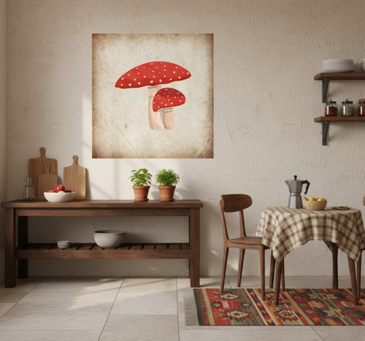 이 작품은 독특한 흰 반점이 있는 두 개의 생생한 빨간 버섯을 질감 있는 베이지색 배경에 배치하여 표현하고 있습니다. 이 일러스트는 이러한 균류의 매력을 포착하며 기발하고 자연적인 미학을 보여줍니다. 아늑한 분위기를 향상시키기에 완벽한 이 작품은 어떤 방에서도 매력적인 중심 요소가 됩니다. 주방용 포스터 아마니타 버섯 일러스트레이션