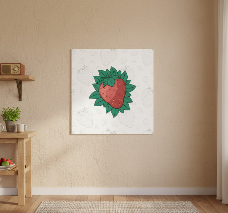 이 생동감 넘치는 일러스트는 푸른 잎들로 둘러싸인 큰 만화 스타일의 딸기를 보여줍니다. 이 작품은 작은 딸기와 잎의 희미한 윤곽이 장식된 밝은 배경에 중심을 두고 있습니다. 따뜻한 색상과 장난기 있는 디자인이 어우러져 어떤 공간에도 신선함을 더해주는 초대하고 즐거운 분위기를 만들어냅니다. 주방용 포스터 신선한 딸기와 푸른 잎사귀