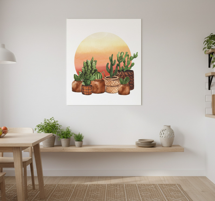 이 생기 넘치는 작품은 부드럽고 혼합된 석양 배경을 배경으로 매력적인 화분에 배열된 다양한 선인장과 다육 식물을 특징으로 합니다. 테라코타의 자연스러운 질감과 earthy tones가 신선한 녹색을 강조하며, 홈 데코 애호가들에게 이상적인 따뜻하고 초대하는 분위기를 만들어냅니다. 주방용 포스터 원 안의 선셋과 선인장