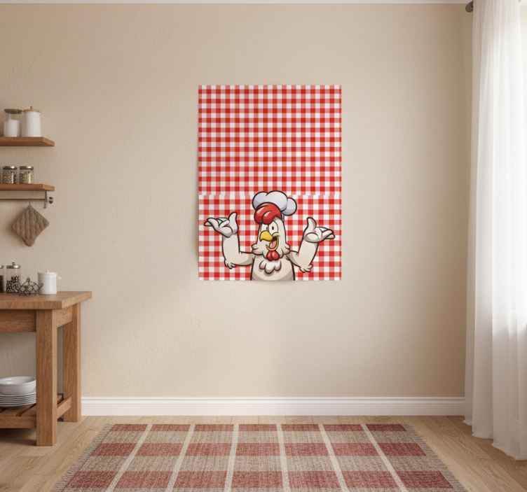 명랑한 만화 스타일의 닭 요리사가 하얀 모자와 앞치마를 착용하고 prominently displayed. 이 캐릭터는 팔을 벌려 손님을 초대하는 듯한 모습입니다. 이 사랑스러운 캐릭터를 둘러싸고 있는 것은 생동감 넘치는 빨간색과 흰색 체크무늬로, 따뜻한 주방 분위기를 더해줍니다. 주방용 포스터 만화 치킨 요리사