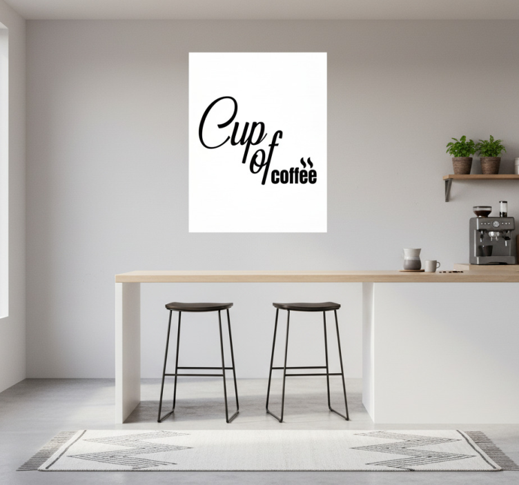 이 이미지는 'Cup of coffee'라는 세련된 인용 아트 작품이 있는 미니멀리스트 주방 인테리어를 보여줍니다. 디자인은 우아한 타이포그래피를 포함하여 고요한 분위기를 강조합니다. 나무 카운터에 두 개의 세련된 바 스툴이 배치되어 있으며, 화분에 담긴 식물이 더해져 아늑하고 현대적인 분위기를 만들어냅니다. 주방용 포스터 커피 한 잔 미니멀 스타일 쿼드레 3