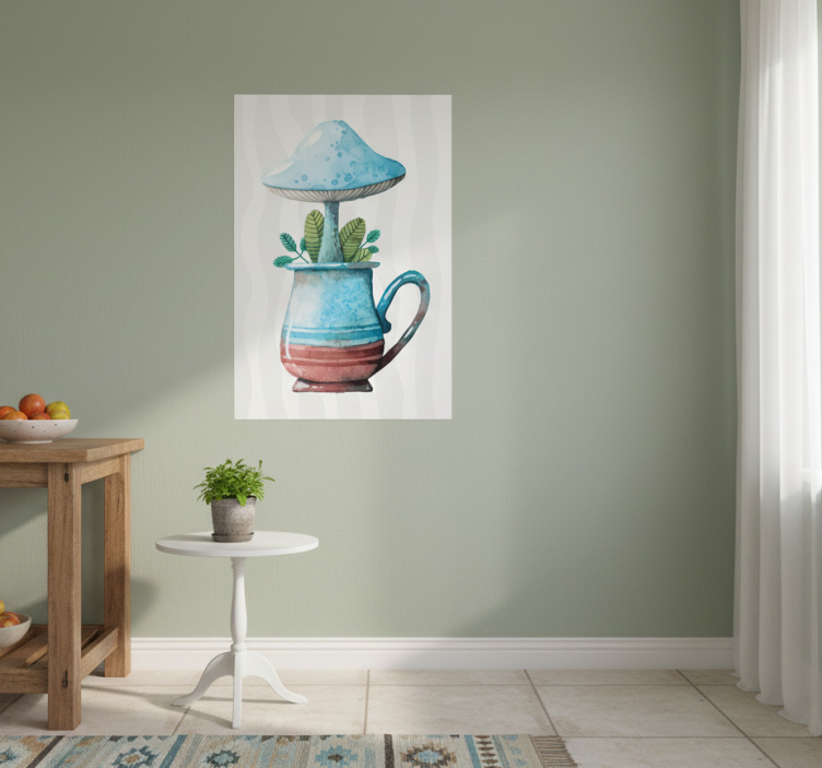 이 기발한 예술 작품은 다채로운 주전자에서 풍성한 초록 잎으로 장식된 파란 버섯이 나오는 모습을 담고 있습니다. 부드러운 수채화 스타일이 고요한 분위기를 만들어내어, 집 장식에 적합합니다. 자연적인 색조와 장난기 가득한 디자인이 창의력을 불러일으키며, 어떤 공간에서도 매력적인 중심 요소가 됩니다. 주방용 포스터 귀여운 버섯 디자인 컵