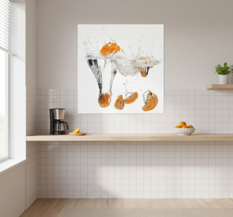 참조:: G656미니멀리스트 주방 설정에서, 놀라운 예술 작품이 생생한 오렌지가 맑은 물속으로 튕겨져 들어가는 모습을 묘사하고 있습니다. 거품이 과일 주위를 춤추며 상쾌한 시각적 효과를 만들어냅니다. 커피 메이커가 근처에 놓여 있고, 더 많은 오렌지가 담긴 그릇이 선반에 놓여 있어 이 공간의 매력적인 분위기를 더욱 높이고 있습니다.