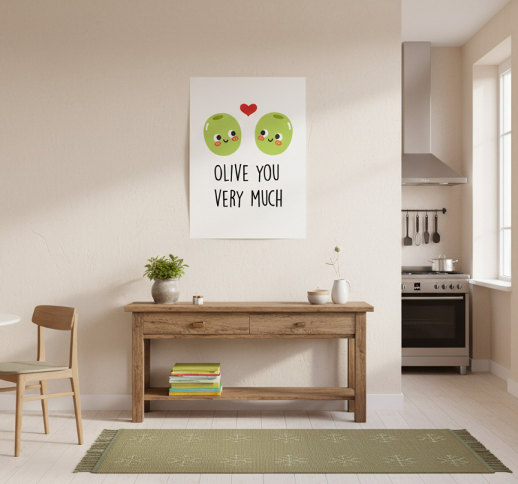 이 매력적인 이미지는 장난스럽고 미소 짓고 있는 두 개의 초록 올리브가 장미빛 뺨과 함께 하트를 위에 장식하고 있는 모습을 담고 있습니다. 이 사랑스러운 캐릭터 아래에는 'OLIVE YOU VERY MUCH'라는 장난기 가득한 문구가 재미있는 글꼴로 표시되어 있습니다. 이러한 요소들은 개인 공간이나 선물에 적합한 경쾌한 분위기를 만들어냅니다. 주방용 포스터 올리브와 함께하는 재미있는 인용구