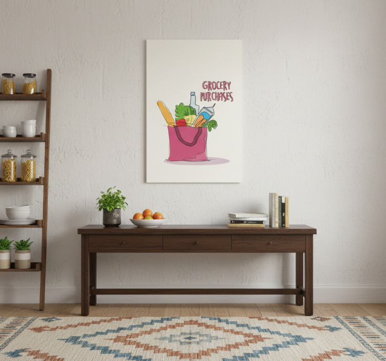 이 이미지는 다양한 신선한 품목, 채소와 음료수 병이 가득 담긴 화려한 분홍색 장바구니를 보여줍니다. 이 다채로운 배열 위에는 'Grocery Purchases'라는 문구가 눈에 띄게 표시되어 있습니다. 전체적인 미 aesthetic은 재미와 기능성을 혼합하여 일상적인 쇼핑 필수품을 강조하고 건강한 라이프스타일을 촉진합니다. 주방용 포스터 식료품 일러스트레이션