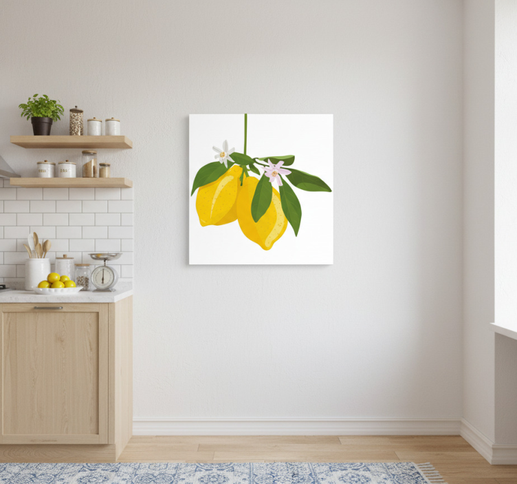 이 생동감 넘치는 묘사는 풍부한 녹색 잎들 사이에 자리 잡은 두 개의 밝은 노란 레몬을 보여줍니다. 감귤 과일과 함께 섬세한 흰 꽃들이 어우러져 우아한 느낌을 더합니다. 이 작품은 깨끗한 흰색 배경을 배경으로 하여 장면의 신선함을 강조하며, 주방이나 식사 공간에 적합합니다. 주방용 포스터 레몬 나무