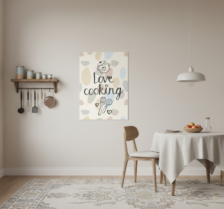 이 이미지는 아늑한 주방 환경을 보여주며, 요리에 대한 열정을 표현하는 벽 아트 작품이 특징입니다. 미니멀한 디자인으로 'Love cooking'이라는 문구와 함께 매력적인 주방 도구 일러스트가 함께 있습니다. 나무 선반에는 병들이 놓여 있고, 식탁보로 장식된 식탁은 방의 아늑한 분위기를 더욱 돋보이게 합니다. 주방용 포스터 사랑하는 요리 텍스트
