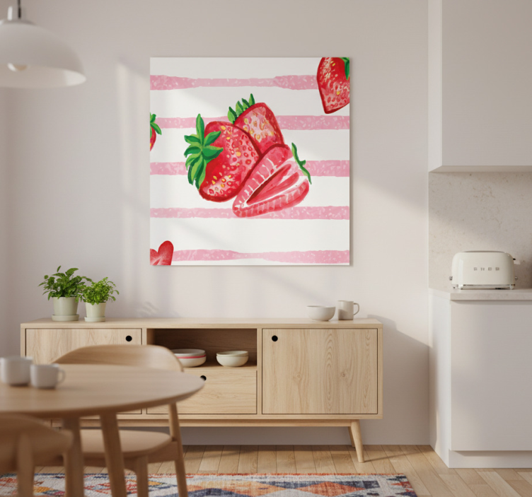 이 생동감 넘치는 이미지는 장난기 가득한 분홍색 줄무늬 배경에 맛있는 딸기 배열을 특징으로 하고 있습니다. 잘 익은 빨간 과일들은 예술적으로 그려져 있으며, 풍성한 초록색 잎과 즙이 많은 질감을 보여줍니다. 이 기분 좋은 디자인은 어떤 공간에도 상쾌한 느낌을 더해 주며, 주방이나 식사 공간을 더욱 돋보이게 만드는 데 안성맞춤입니다. 주방용 포스터 스트라이프 배경의 무한 딸기