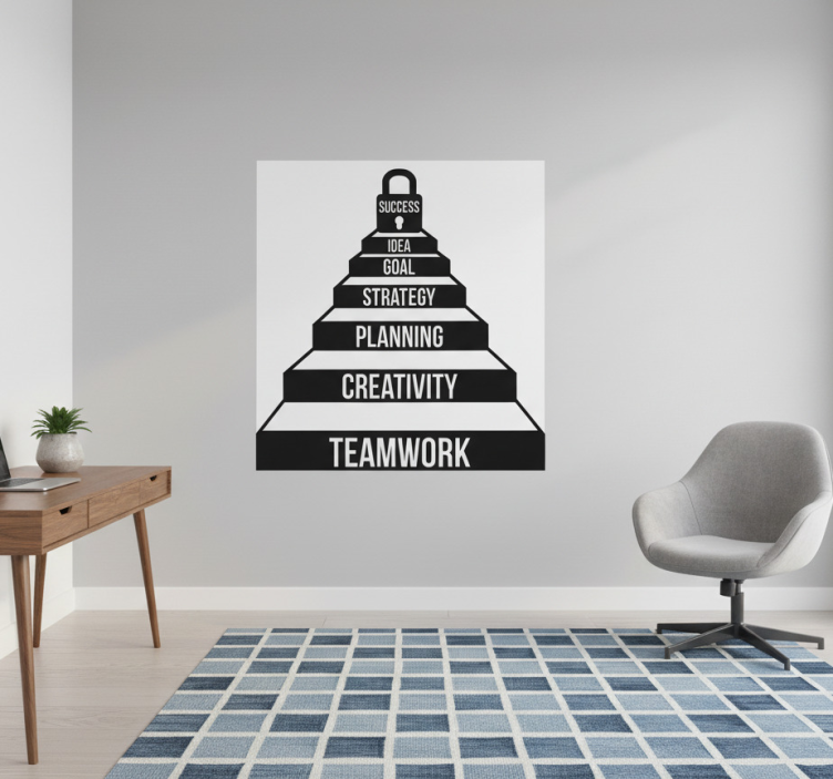 이 시각적으로 인상적인 이미지는 피라미드 형태로 쌓인 다양한 핵심 개념을 가진 계단 디자인을 특징으로 합니다. 각 단계는 성공을 달성하는 데 필수적인 요소인 teamwork, creativity, planning, strategy, goal, 및 idea를 나타냅니다. 흑백 색상 조합은 명확성과 임팩트를 강화합니다. 사무실용 침실 포스터 더 큰 동기 부여 작업 공간입니다