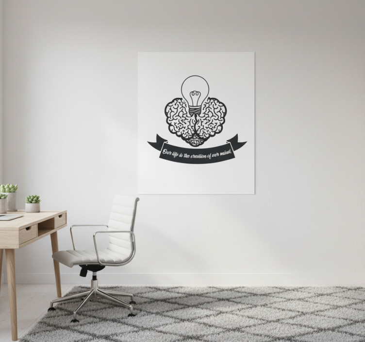 이미지는 창의성과 지성을 상징하는 전구와 뇌 디자인을 결합한 인상적인 벽 예술 작품을 보여줍니다. 아래에는 'Our life is the creation of our mind.'라는 배너가 있습니다. 이 작품은 현대적인 작업 공간에 전시되어 있으며, 환경에 영감을 주는 요소를 더하고 혁신적인 사고를 촉진합니다. 사무실용 침실 포스터 우리의 마음과 뇌의 창조