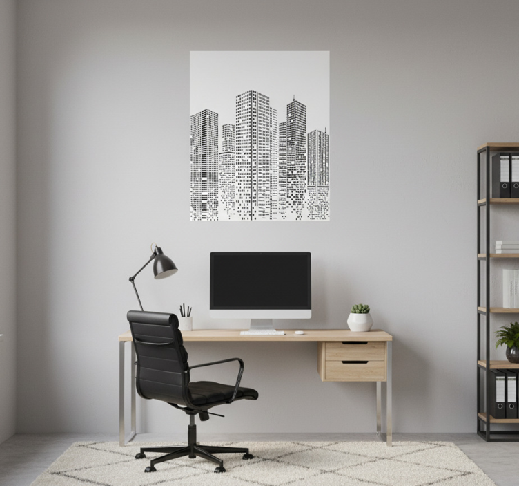 이 이미지는 세련된 책상과 인체공학적인 검은색 의자가 있는 현대적인 작업 공간을 보여줍니다. 컴퓨터 모니터는 중앙에 배치되어 있으며, 스타일리시한 책상 램프가 이를 보완합니다. 위에는 도시 스카이라인의 예술적 묘사가 현대적인 미감을 더해주어 창의성과 생산성의 전반적인 분위기를 향상시킵니다. 사무실용 침실 포스터 스카이라인 커튼