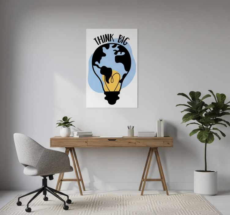 이 이미지는 지구와 얽힌 전구를 특징으로 하는 창의적인 일러스트레이션을 보여줍니다. 위쪽의 굵은 텍스트는 'THINK BIG'이라고 적혀 있어 영감을 주는 주제를 강조합니다. 색상 팔레트는 부드러운 파란색, 노란색, 검은색을 포함하여 현대적이고 사유를 자극하는 디자인을 전달합니다. 이 작품은 동기 부여가 필요한 공간에 적합합니다. 사무실용 침실 포스터 전구 모양의 세계