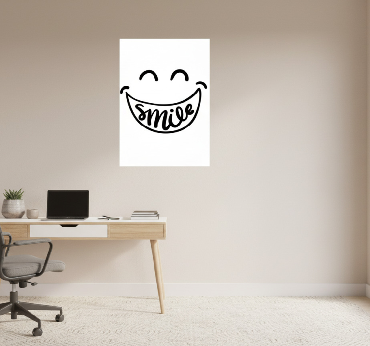 이 이미지는 미니멀한 작업 공간을 보여주며, 밝은 색상의 벽 예술 작품에 기분 좋은 스마일 얼굴과 'smile'이라는 단어가 두드러지게 나타나 있습니다. 배경은 전체적인 미적 감각을 보완하며, 세련된 책상과 현대적인 의자가 초대하는 분위기를 더욱 돋보이게 만들어, 영감과 긍정성을 위한 완벽한 설정을 제공합니다. 사무실용 침실 포스터 미소