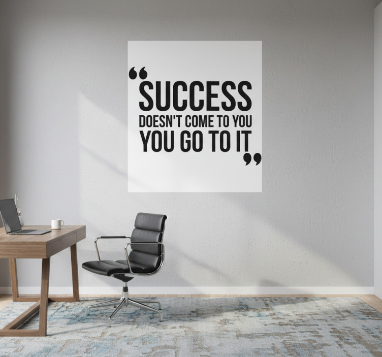 이 이미지는 성취를 위한 적극적인 접근 방식을 강조하는 동기 부여 문구가 적힌 미니멀한 작업 공간을 보여줍니다. 세련된 검은색 의자가 나무 책상을 보완하며, 책상 위에는 노트북이 있어 영감을 주는 분위기를 만들어냅니다. 러그는 따뜻함을 더해 전체적인 미적 감각을 향상시킵니다. 사무실용 침실 포스터 성공적인 멋진 디자인