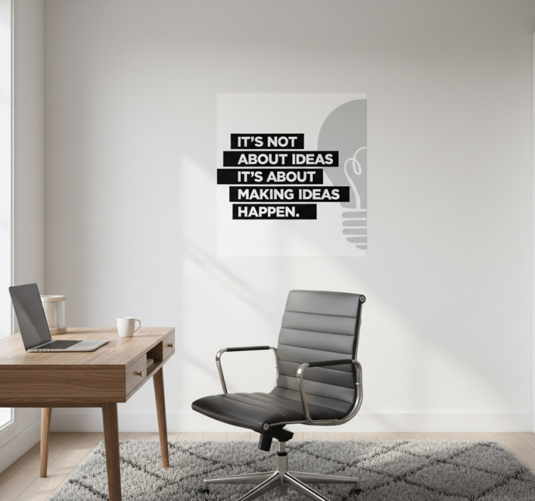스타일리시한 홈 오피스 설정은 나무 책상 옆에 세련된 검은 의자가 있습니다. 테이블 위에는 노트북과 커피 컵이 놓여 있습니다. 벽에는 영감을 주는 포스터가 붙어 있으며, 행동의 중요성을 강조하며 "ideas"가 아니라 그것들의 "realization"에 관한 것이라고 말합니다. 현대적인 미학이 창의성을 촉진합니다. 사무실용 침실 포스터 아이디어에 대한 텍스트