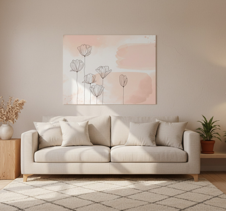 이 이미지는 부드러운 색조의 소파에 푹신한 베개가 놓인 평화로운 거실 공간을 보여줍니다. 그 뒤에는 미니멀한 꽃 그림이 걸려 있으며, 차분한 파스텔 배경 위에 섬세한 선으로 그린 꽃들이 전시되어 있습니다. 화분에 심어진 식물과 장식용 꽃병이 자연 요소를 더해 방의 고요한 분위기를 한층 더합니다. 꽃과 식물이 있는 포스터 꽃의 선들