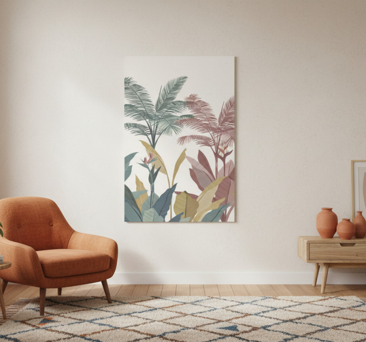 이 이미지는 스타일화된 열대 식물들이 배열된 아름답게 디자인된 벽을 보여줍니다. 다양한 잎의 형태와 색조가 조화롭게 어우러져 고요한 분위기를 만들어냅니다. 우아한 오렌지색 안락의자가 장식을 보완하며, 장식용 화분이 놓인 나무 사이드 테이블이 아늑한 방에 따뜻함을 더합니다. 꽃과 식물이 있는 포스터 테라코타 열대 식물