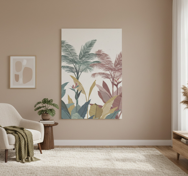 이 평화로운 거주 공간은 부드러운 색조로 장식된 무성하고 스타일화된 잎사귀를 보여주는 대형 예술 작품이 특징입니다. 편안한 의자에는 뜨개질한 담요가 놓여 있어 나무 사이드 테이블 옆에 앉아 아늑한 공간을 제공합니다. 화분에 심어진 식물이 자연스러운 느낌을 더해 방의 고요한 분위기를 한층 향상시킵니다. 꽃과 식물이 있는 포스터 열대 식물 모티프는 자연의 아름다움을 집안에 담아주는 독특한 디자인입니다. 이 포스터는 다양한 열대 식물의 생동감 넘치는 색상과 패턴을 통해 공간을 화사하게 만들어줍니다. 그래픽 디자인에는 다채로운 꽃과 식물이 조화롭게 어우러져 있어 눈길을 사로잡습니다. 이 포스터는 단순한 장식을 넘어, 여러분의 공간에 생명력을 불어넣는 중요한 역할을 합니다.