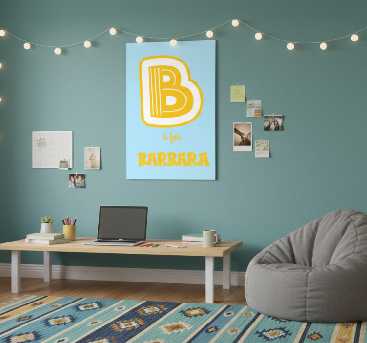 이 이미지는 아늑한 작업 공간을 보여주며, 눈에 띄는 'B' 디자인이 있는 다채로운 벽 예술 작품과 함께 'is for BARBARA.'라는 텍스트가 있습니다. 청록색 배경은 위에 있는 전구 조명과 잘 어울립니다. 나무 책상 위에는 노트북과 문구류가 놓여 있고, 푹신한 빈백이 아늑한 환경에 편안함을 더하고 있습니다. 포스터 청소년 침실 알파벳 개인화
