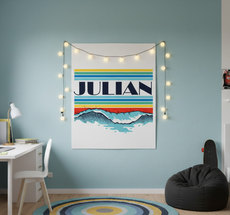 이미지는 'JULIAN'이라는 이름이 두드러지게 표시된 생동감 있는 벽 예술 작품이 있는 스타일리시한 방을 보여줍니다. 파란색, 초록색, 노란색, 빨간색의 다채로운 줄무늬가 역동적인 파도 일러스트와 조화를 이루고 있습니다. 스트링 라이트가 분위기를 한층 더 돋보이게 하여 영감을 주기 완벽한 아늑하고 밝은 분위기를 만들어냅니다. 포스터 청소년 침실 맞춤 이름 바다 풍경은 감각적인 바다 풍경 디자인으로 청소년의 방을 특별하게 만들어주는 제품입니다. 이 포스터는 수채화의 느낌을 살려 해양의 아름다움을 생생하게 전달하며, 자연을 사랑하는 청소년들에게 안성맞춤입니다. 개인의 이름이 포함된 맞춤형 포스터로, 방의 분위기를 한층 더 아늑하고 개성 있게 만들어줍니다.