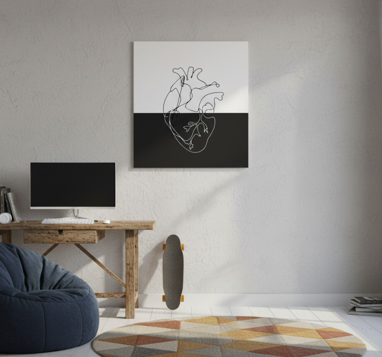이 현대 미술 작품은 검은색과 흰색 배경으로 나뉜 미니멀한 하트 일러스트를 특징으로 합니다. 깔끔한 선들은 하트의 복잡한 구조를 강조하며 매력적인 초점을 만듭니다. 주변 공간은 컴퓨터와 스케이트보드가 있는 아늑한 방을 보여주며 현대적인 미적 감각을 더욱 돋보이게 합니다.