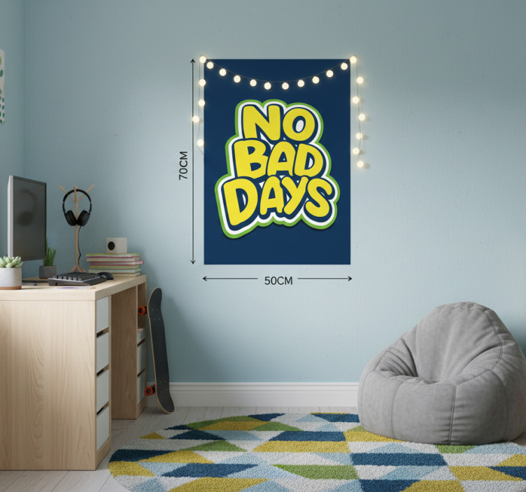이 이미지는 'No Bad Days'라는 문구가 굵고 유쾌한 글씨로 강조된 생동감 넘치는 벽 예술 작품을 보여줍니다. 눈에 띄는 네이비 배경을 배경으로 하여, 이 장식은 긍정적인 분위기를 발산합니다. 주변의 조명은 매력을 더하며, 현대적인 책상과 세련된 바닥이 있는 아늑한 방을 보완합니다. 포스터 청소년 침실 나쁜 날은 없다