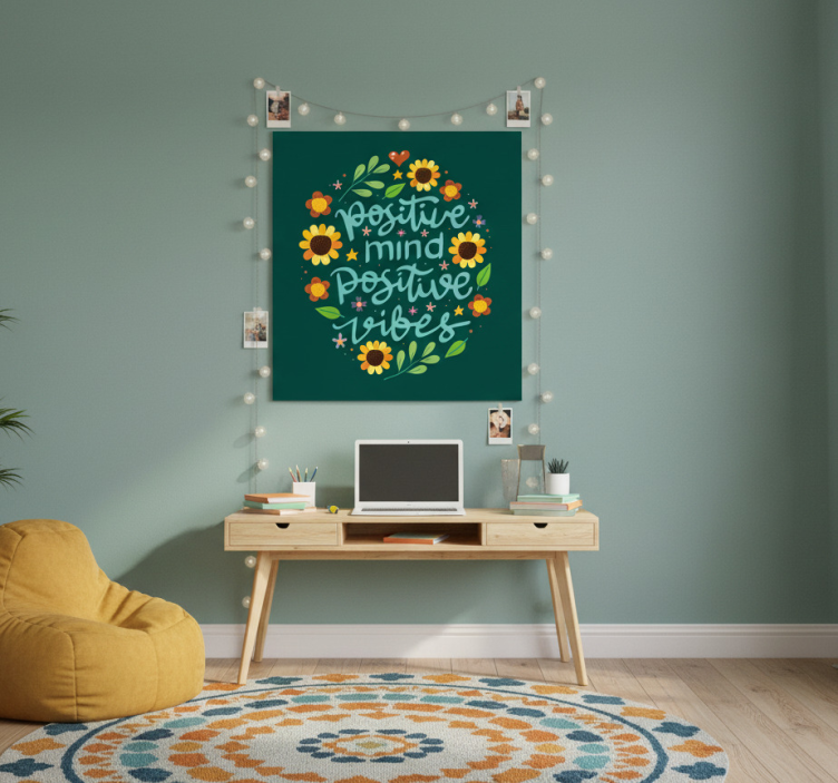 이미지는 편안한 녹색 벽이 있는 세련된 작업 공간을 보여줍니다. 장식 포스터에는 고양감을 주는 메시지가 적혀 있으며, 생생한 꽃과 잎들로 둘러싸여 있습니다. 책상 위에는 노트북, 화분 식물, 문구류가 놓여 있으며, 초대하는 분위기를 더해주는 다채로운 러그가 있습니다. 포스터 청소년 침실 아름다운 색상의 동기 부여 문구