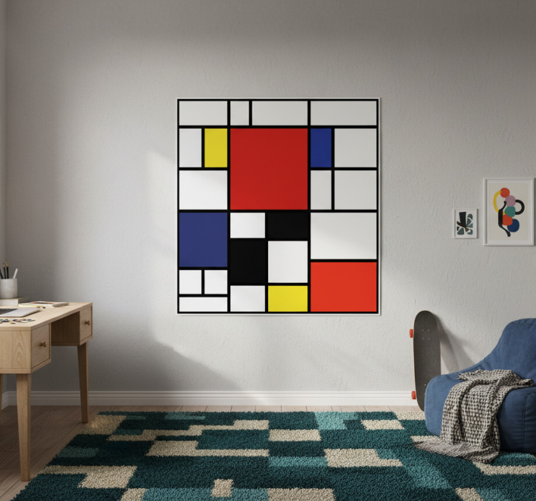 이미지에는 생생한 빨강, 파랑, 노랑, 검정 블록으로 구성된 인상적인 추상 미술 작품이 있는 현대적인 인테리어가 담겨 있습니다. 아늑한 파란색 의자 위에 위치한 이 작품은 현대적인 미학을 보완합니다. 미니멀한 나무 책상과 패턴이 있는 러그가 방의 스타일리시한 분위기를 더욱 돋보이게 합니다. 거실용 포스터 침실 추상 색상 블록