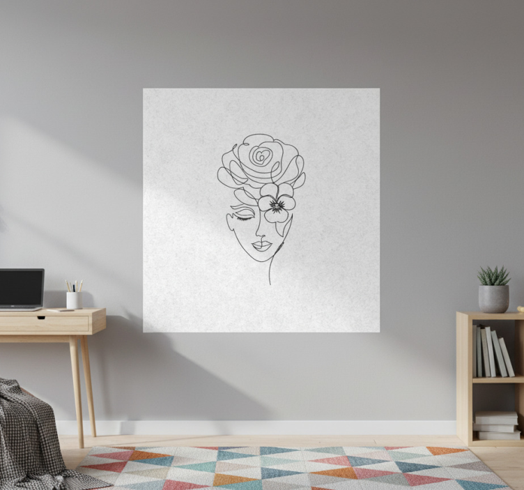 이 예술적 이미지는 꽃으로 장식된 여성의 얼굴을 최소한의 선으로 그린 그림입니다. 우아한 선들이 고요한 표정을 형성하여 아름다움과 우아함을 강조합니다. 꽃의 요소들은 자연과 여성성의 조화를 상징하며 매끄럽게 어우러집니다. 배경은 중립적이며, 작품의 섬세한 디테일과 전체적인 미적 매력을 강조합니다. 거실용 포스터 침실 미니멀리스트 얼굴 없는 여성