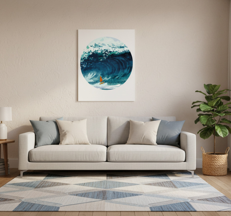 현대적인 거실은 다양한 쿠션으로 장식된 부드럽고 밝은 소파로 꾸며져 있습니다. 그 뒤에는 역동적인 움직임을 포착한 생동감 넘치는 바다 파도 작품이 있으며, 작은 세일보트가 파도를 가로지르고 있습니다. 아늑한 식물과 기하학적 러그가 초대하는 분위기를 더해 편안함과 스타일의 조화를 이루고 있습니다. 거실용 포스터 침실 윈드서프하는 스포츠맨