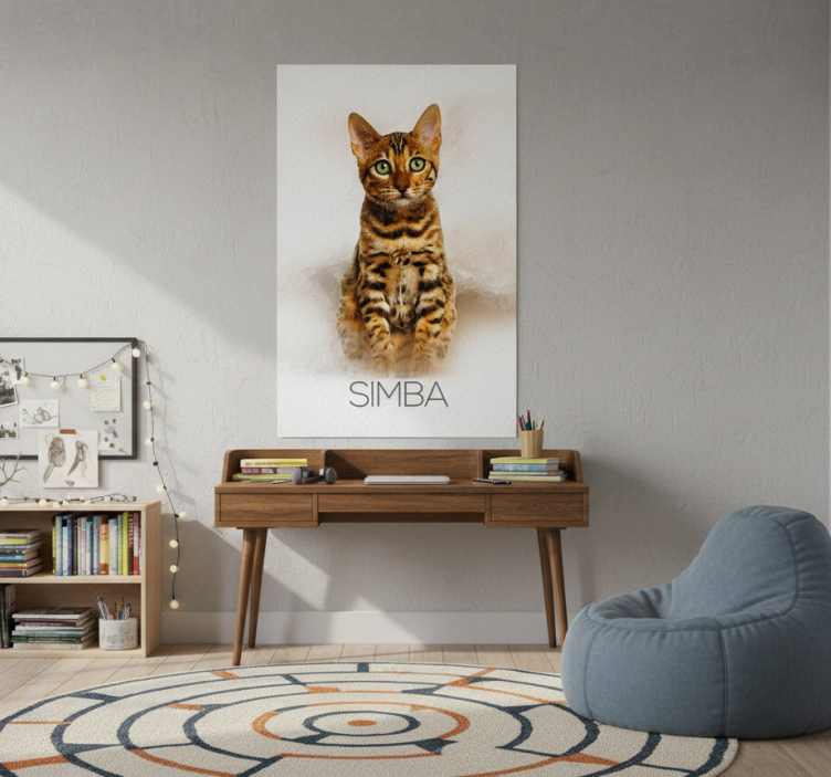 이 예술적 표현은 눈에 띄는 금빛 눈과 생생한 털 무늬를 가진 벵갈 고양이 심바를 보여줍니다. 이미지는 부드럽고 차분한 배경에 복잡한 털의 디테일을 강조하며, 평화로운 분위기를 만들어냅니다. 미니멀한 미학이 전체 장식을 보완하며, 아늑한 작업 공간과 장식적인 분위기를 특징으로 합니다. 거실용 포스터 침실 반려동물 초상화