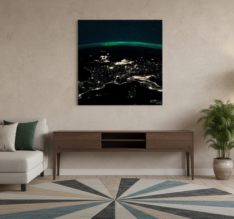 이 이미지는 우주에서 바라본 유럽의 밤 풍경을 아름답게 담고 있으며, 밝게 빛나는 도시 지역과 그 위의 생동감 있는 오로라를 보여줍니다. 어두운 배경 속에서 별들이 반짝이며 고요한 분위기를 더합니다. 이 매혹적인 시점은 인공 조명으로 밝혀진 다양한 문화의 상호 연결성과 지구의 아름다움을 강조합니다. 포스터 세계 지도 공중 야경 모습