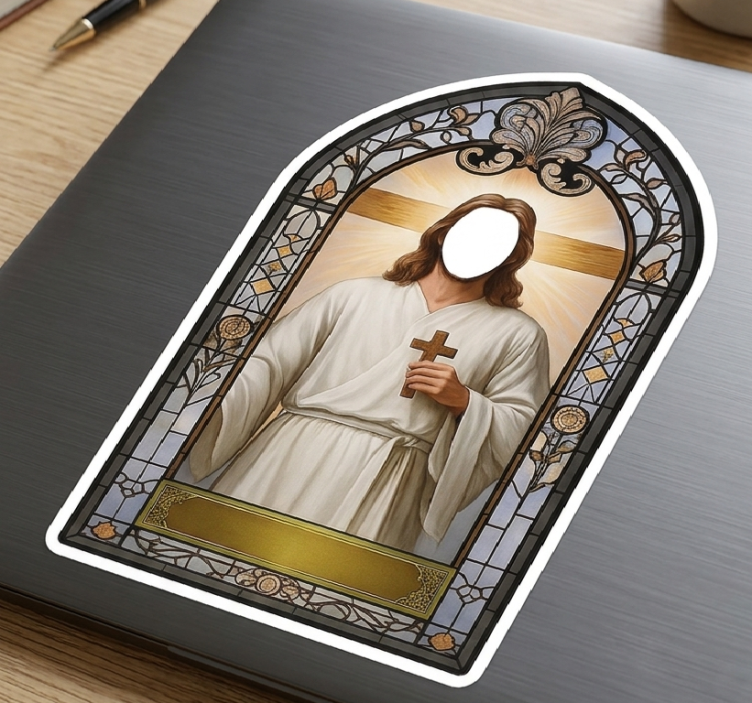 아름답게 디자인된 이미지는 십자가를 들고 있는 인물을 특징으로 하며, 화려한 스테인드 글라스 같은 프레임 안에 배치되어 있습니다. 따뜻하고 빛나는 배경은 중앙 인물의 고요하고 매력적인 존재감을 강조합니다. 하단의 맞춤형 영역은 개인화를 허용하여 이 작품을 독특한 장식 요소로 만들어 줍니다. 맞춤 스티커 예수 성인 맞춤형