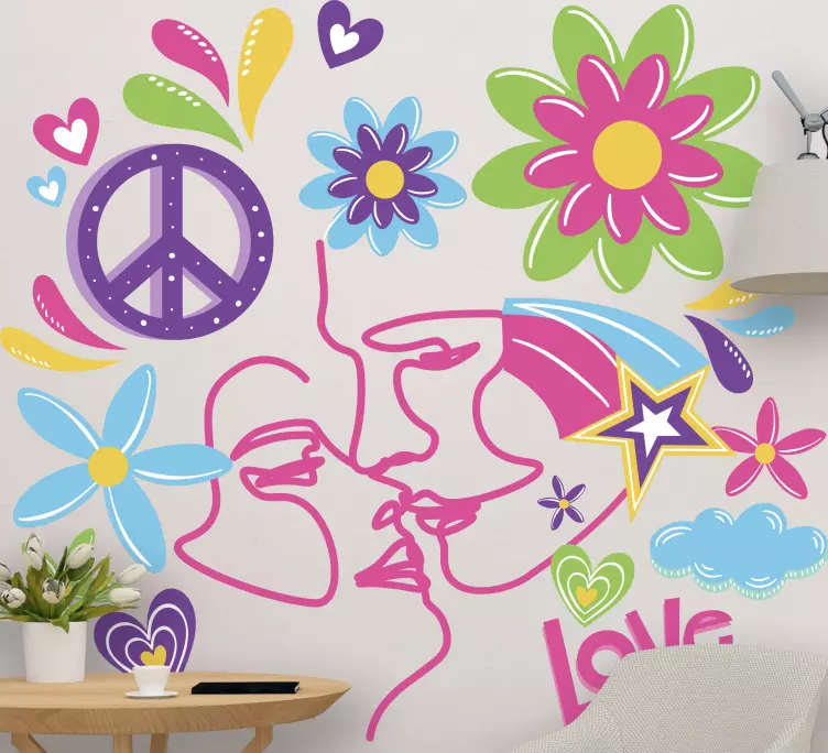 참조:: A48089서로 얽힌 얼굴, 다채로운 꽃, 그리고 사랑과 평화를 상징하는 하트 모양이 어우러진 생동감 넘치는 구성. 이 활기찬 배열은 장난기 가득한 분위기를 발산하여 개인 공간에 매력적인 요소가 되어 따뜻하고 초대하는 분위기를 조성합니다.