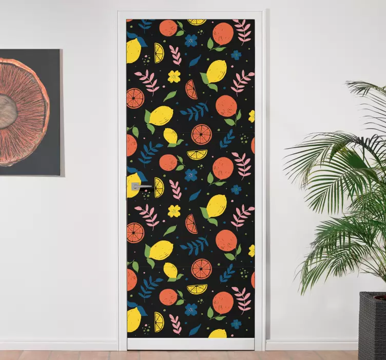 문 스티커 다채로운 감귤 패턴우리의 문 스티커 다채로운 감귤 패턴은 과일과 감귤류의 생동감 넘치는 색깔로 디자인되었습니다. 오렌지와 레몬을 주제로 한 이 독특한 문 스티커는 아름다운 꽃무늬와 함께 떠는 그림 물감의 매력을 지니고 있습니다. 검정색 배경 위에 놓인 이 삽화는 공간에 활기를 불어넣어 줄 것입니다.