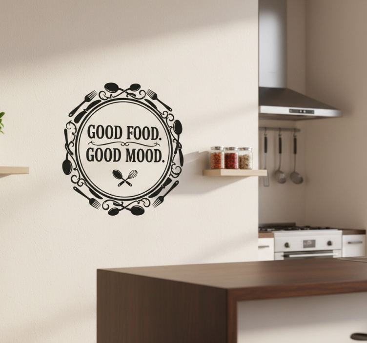 장식적인 주방 벽 디자인은 주방 도구로 장식된 원형 테두리를 특징으로 합니다. 눈에 띄는 문구 "GOOD FOOD. GOOD MOOD."는 즐거운 식사와 긍정적인 분위기 사이의 연결을 강조하며, 즐거운 요리 공간을 영감을 줍니다. 이는 주방 장식을 향상시키고자 하는 음식 애호가와 가정 요리사에게 이상적인 포인트입니다. 부엌 벽 스티커 레트로 사랑의 주방 명언