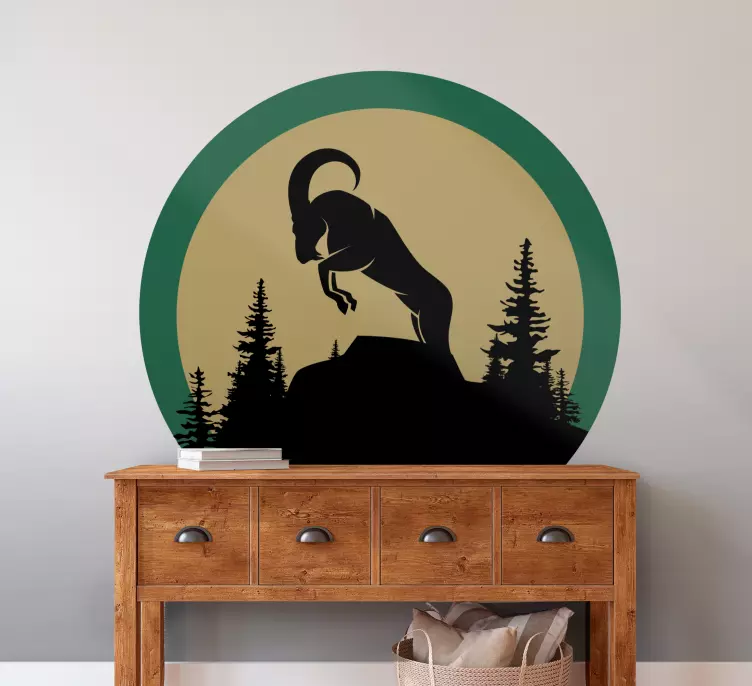 참조:: A48507부드러운 색조의 원형 배경 속에서 우뚝 솟은 나무들에 둘러싸인 채 점프하는 중인 산양의 인상적인 실루엣. 이 디자인은 모험의 감각과 야생 동물의 본질을 불러일으키며, 자연과 대자연에서 영감을 받은 이들에게 완벽합니다.