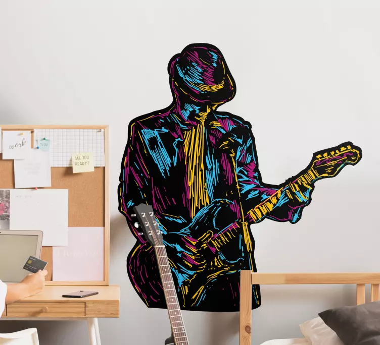 참조:: A48543스타일리시한 정장과 모자를 쓴 기타리스트의 생동감 넘치는 실루엣이 공연 중간에 포착되었습니다. 이 예술적 표현은 음악의 에너지를 강조하기 위해 대담한 색상을 사용하여 음악 애호가들에게 완벽한 추가 요소가 됩니다.