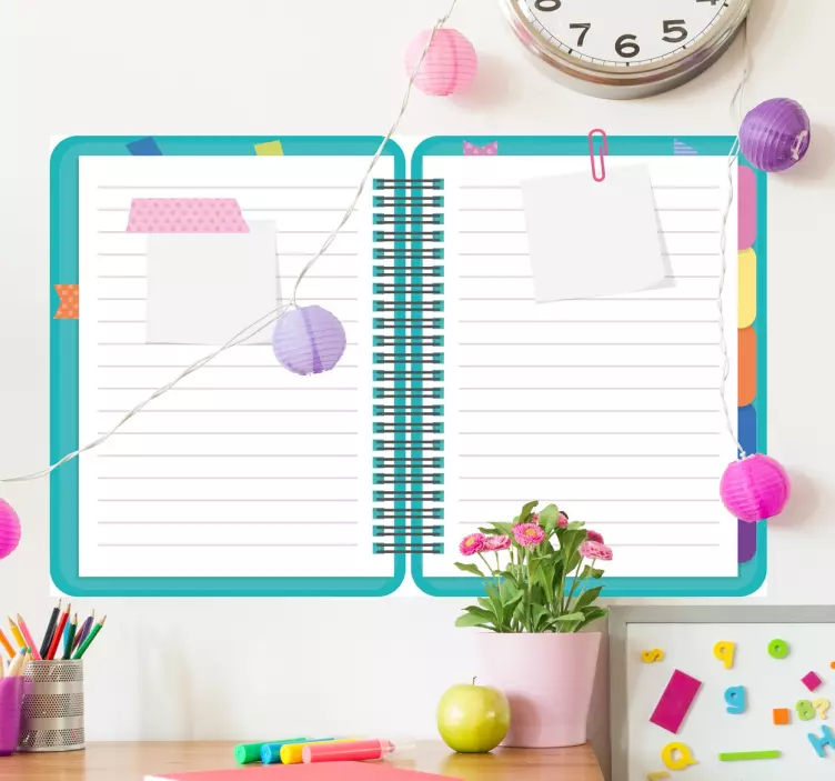 이 멋진 스티커로 편성을 하세요! 제공된 펜으로 벽에 쉽게 바르고 자유롭게 그릴 수 있습니다. 펜과 종이보다 훨씬 더 효과적인 중요한 알림 및 약속을 기록하십시오! 다른 색깔의 탭이 있는 노트북의 장식 디자인은 침실이나 사무실 공간에 이상적입니다.