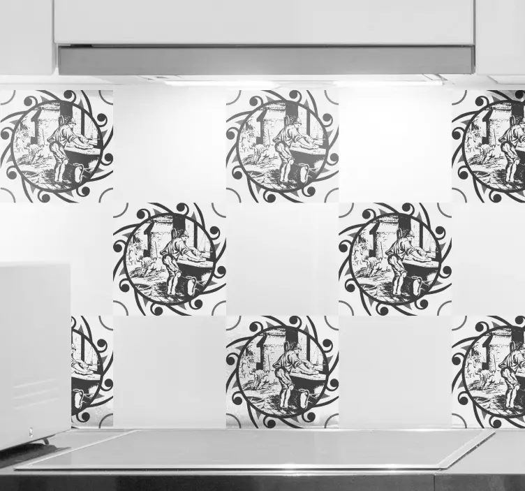 참조:: A52160이 디자인은 빈티지 공예 장면을 특징으로 하며, 테이블에서 열심히 작업하는 장인이 소용돌이치는 장식 요소들로 둘러싸여 있습니다. 섬세한 디테일은 향수와 예술성을 포착하여 어떤 공간에도 눈길을 끄는 요소가 됩니다.