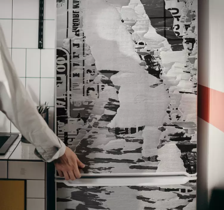 모노크롬 질감과 타이포그래피의 콜라주로 구성된 추상적이고 도시적인 냉장고 랩은 주방 가전제품에 현대적이고 독특한 감성을 더합니다.