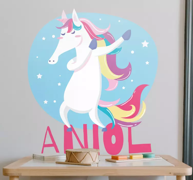 참조:: A47669활기찬 유니콘이 편안한 파란색 배경에서 기쁘게 춤추고 있으며, 별들로 둘러싸여 있습니다. 이 디자인은 어린 시절과 상상력의 기발한 정신을 포착하여 개인 공간에 즐거운 선택이 됩니다. 이 제품은 독특한 터치를 추가하기 위해 개인화할 수 있습니다.
