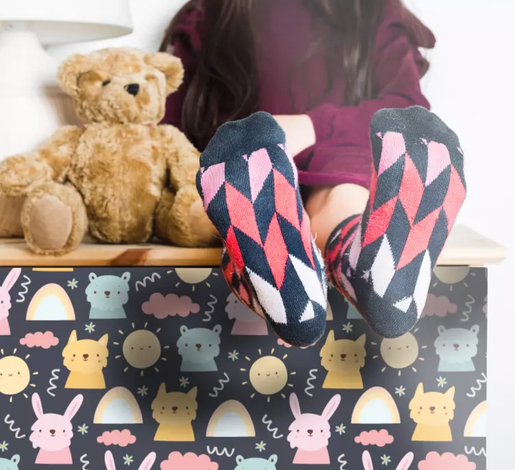 참조:: A51583다양한 귀여운 동물 캐릭터, 기분 좋은 구름, 그리고 태양이 어우러진 장난스러운 디자인. 파스텔 색상과 기발한 요소의 조합이 어린이 공간에 완벽한 선택이 되어, 밝고 초대하는 분위기를 만들어냅니다.