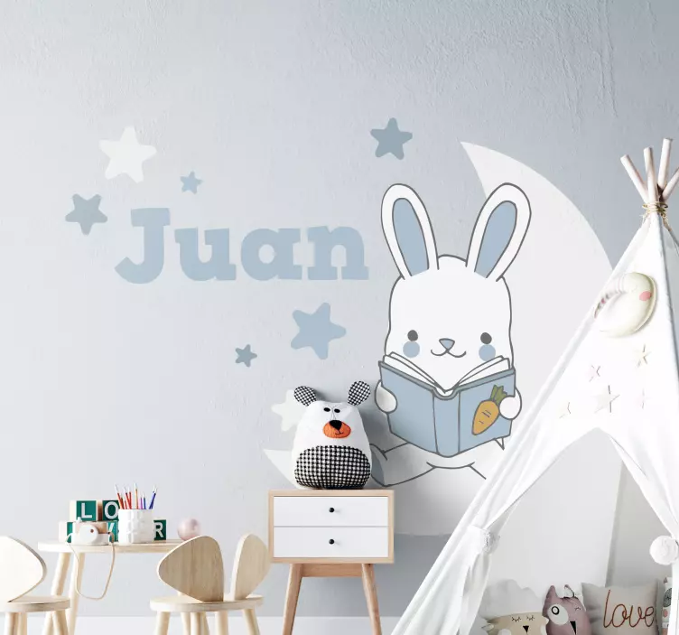 참조:: A51047매력적인 토끼가 책을 읽고 있는 기발한 디자인으로, 별들과 초승달이 둘러싸고 있습니다. 어린이의 공간을 개인화하기에 완벽한 이 장난기 가득한 테마는 어린 독자들을 격려하고 방에 마법의 터치를 더합니다.