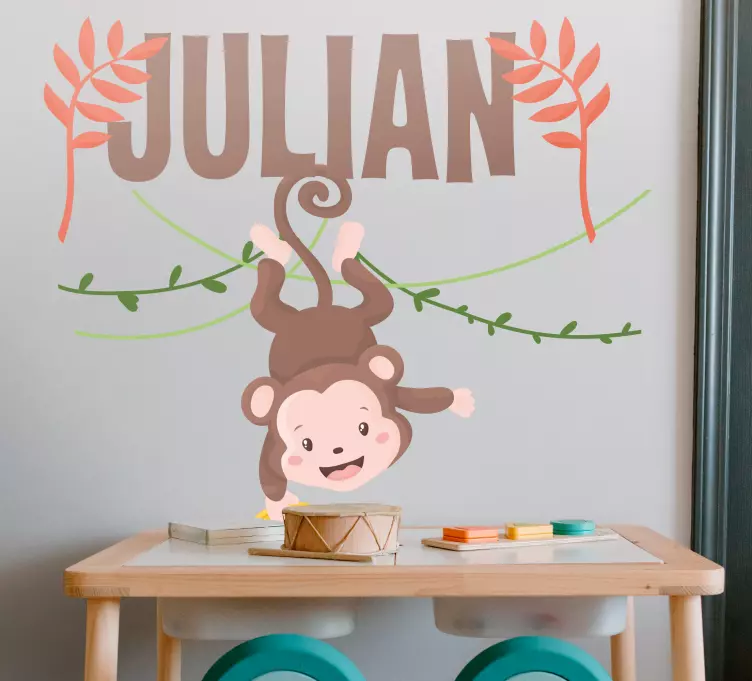 매력적인 디자인으로, 귀여운 원숭이가 덩굴에서 거꾸로 매달려 있습니다. 이 디자인은 생동감 넘치는 잎사귀와 개인화 옵션을 포함하고 있어 어린이 공간에 적합합니다. 원숭이의 장난기 가득한 표정이 어떤 환경에도 즐거운 느낌을 더해줍니다.