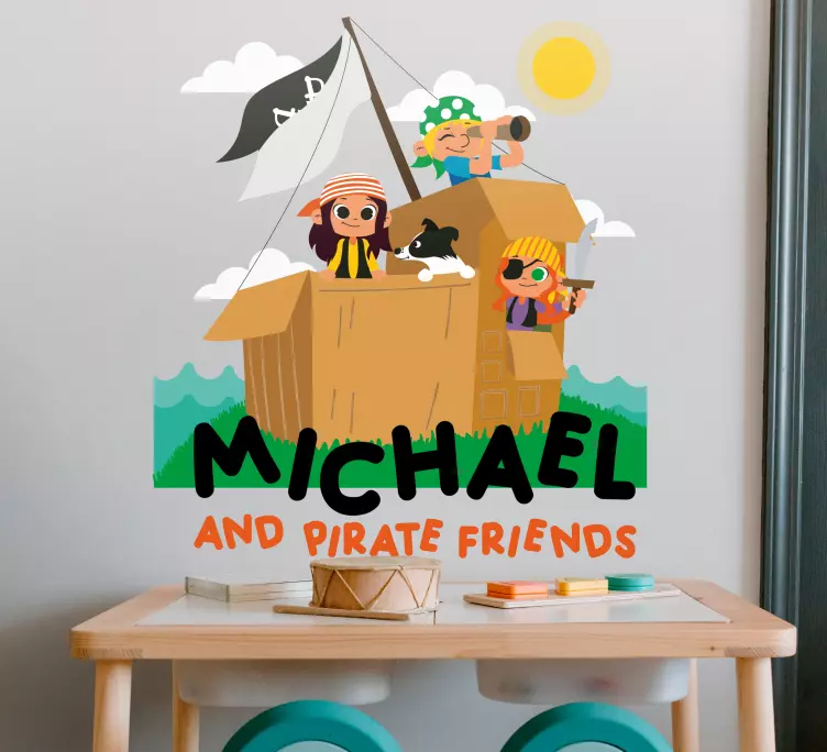 참조:: A48764아이들이 해적 복장을 하고 판지 배에 탄 활기찬 장면, 돛과 장난스러운 개가 함께 있습니다. 이 디자인은 어린 시절의 상상력과 모험의 본질을 포착하여 아이의 공간에서 즐거운 분위기를 만드는 데 완벽합니다.